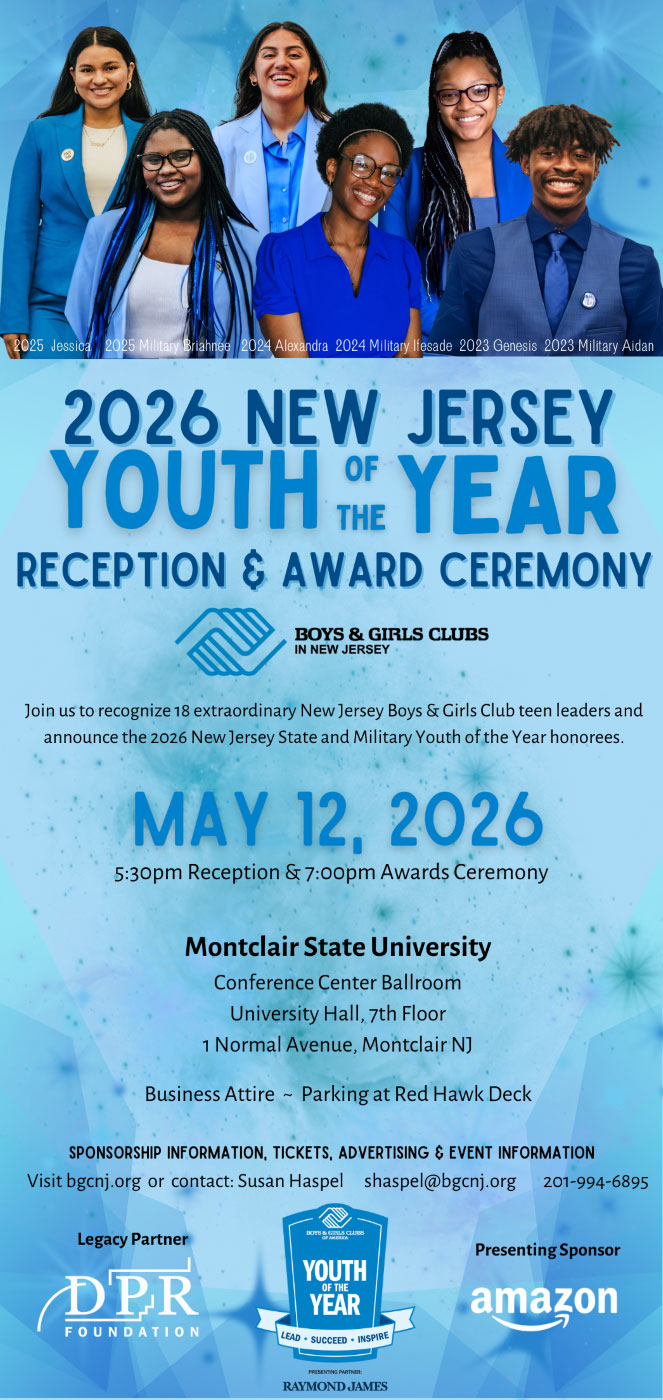 On May 12, 2026, at Montclair State University, we will celebrate these extraordinary teens at the New Jersey Youth of the Year Reception and Award Ceremony. Thanks to corporate partners like our Legacy Partner, DPR Construction, and Presenting Sponsor, Amazon, more than $50,000 in scholarship funds will be awarded, providing crucial support as these young leaders pursue higher education and brighter futures.